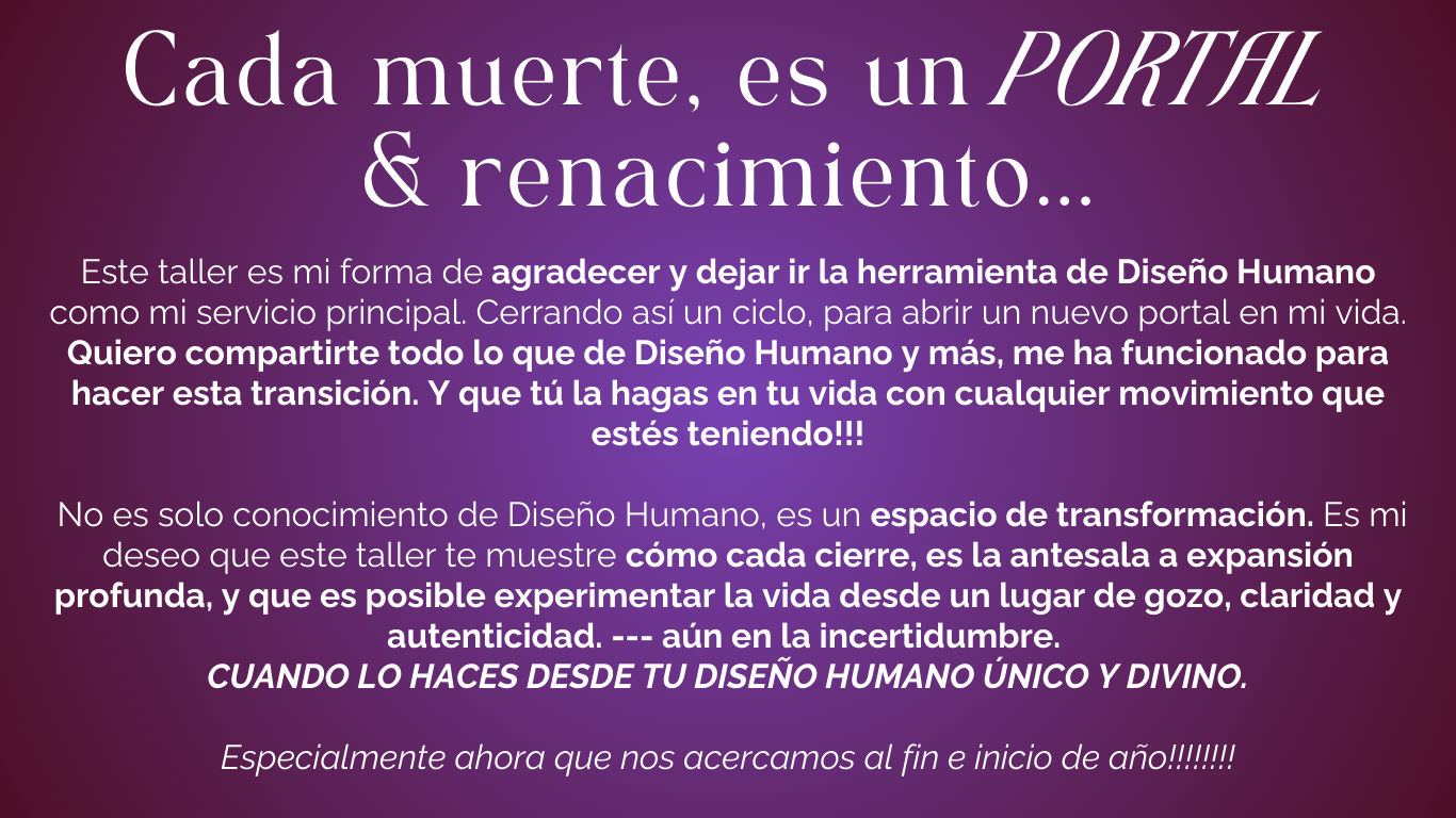 Este taller es mi forma de agradecer y soltar el Diseño Humano como mi servicio principal. Es una despedida desde el corazón y una invitación para que, al igual que yo, encuentres en tu diseño un punto de apoyo y expansión en cada cambio que enfrentes.