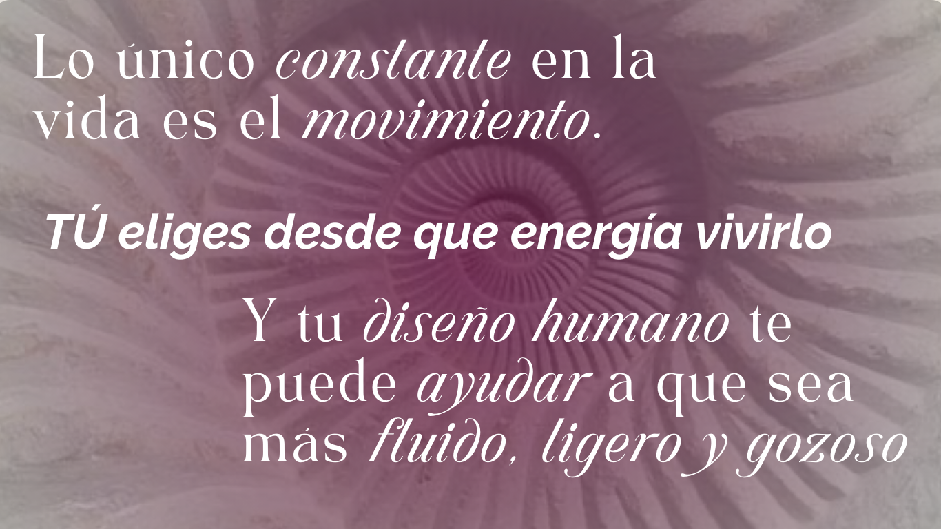 Deseas comprender y aprovechar tu tipo de aura, estrategia y autoridad de Diseño Humano. EN cualquier momento de la vida; o sea en el movimiento constante que siempre está presente en nuestro camino