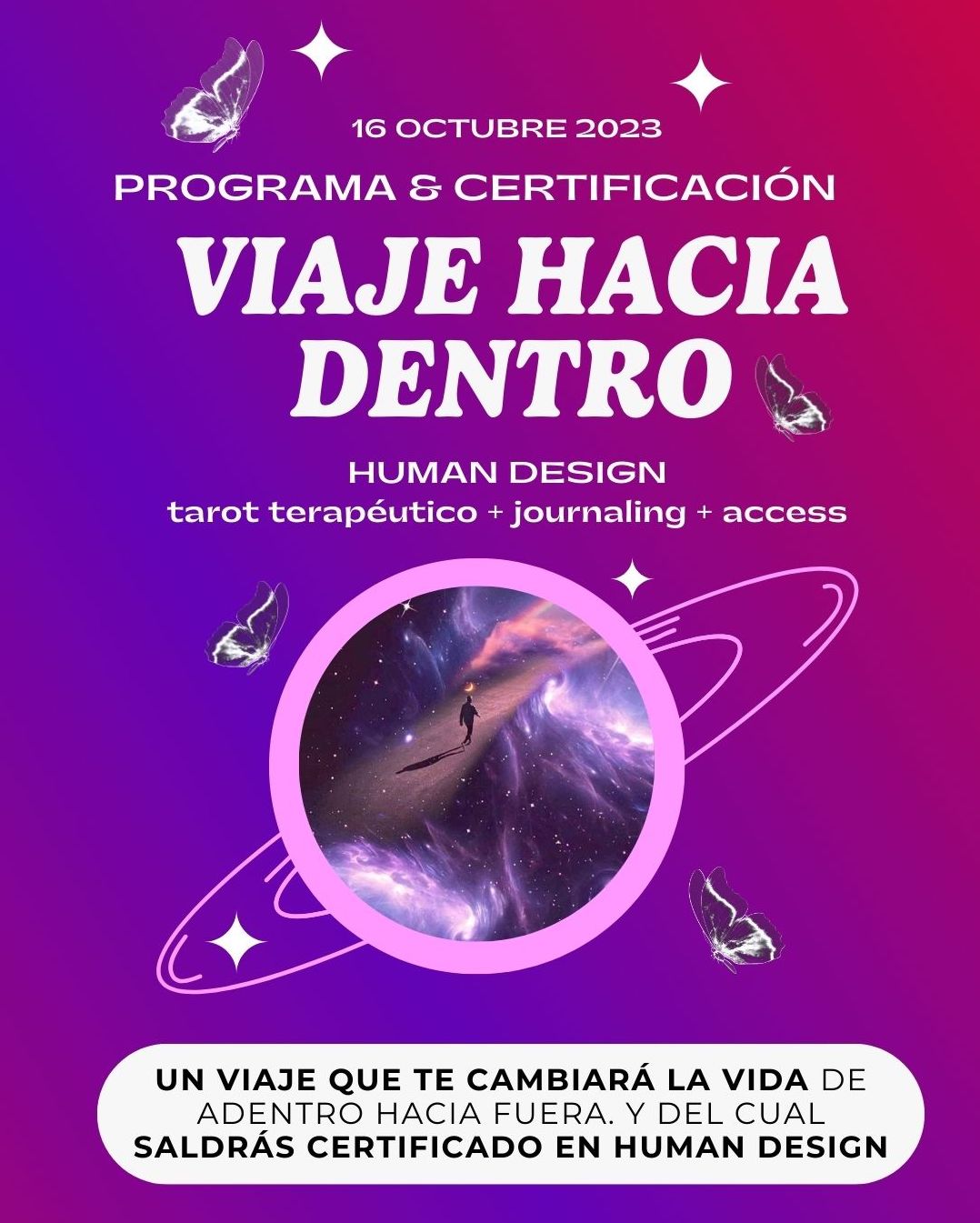es un programa online que te certifica en Human Design, apoyándonos de otras 3 herramientas autoconocimiento y transformación + Tarot + Access + Journaling, para ir muuucho más profundo!!